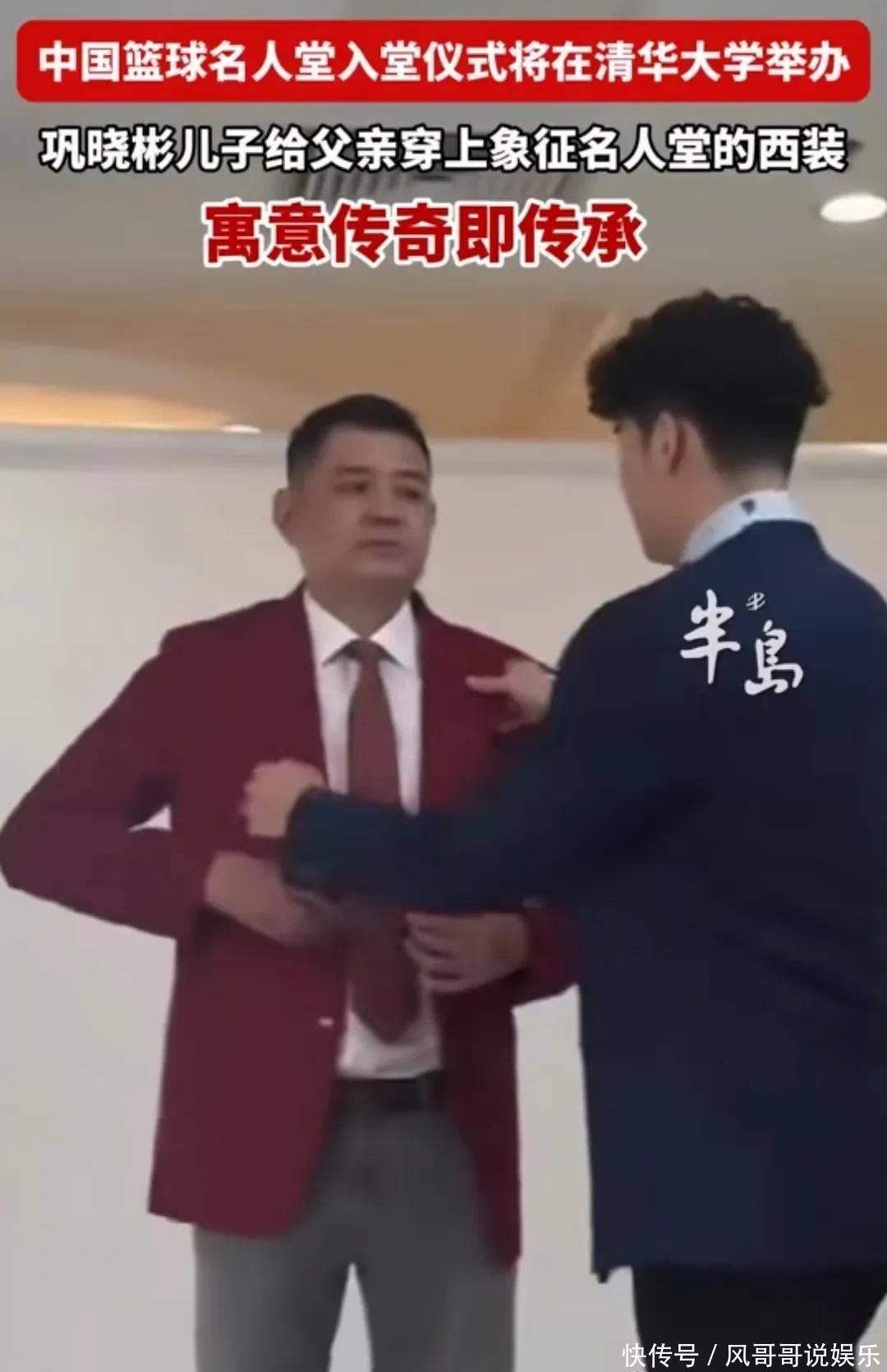 这次巩晓彬不是一个人来的,上场前是他儿子给他穿上名人堂的西装,整理一番。